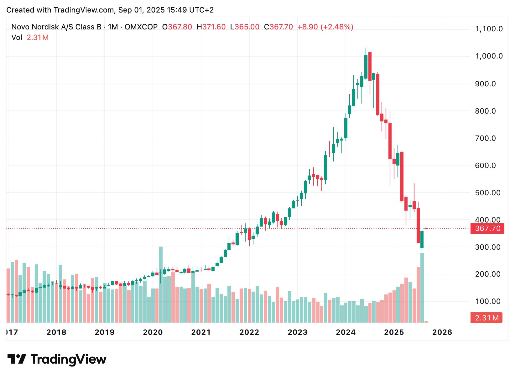Novo Nordisk, la gigante danesa líder en diabetes y obesidad, vivió un ascenso meteórico en los últimos años, impulsada por medicamentos revolucionarios, seguido de un fuerte desplome en bolsa hasta mínimos no vistos desde 2022. Llegó a ser la empresa más valiosa de Europa gracias a sus fármacos Ozempic y Wegovy para la diabetes y la pérdida de peso. Sin embargo, desde los máximos de junio de 2024 sus acciones han corregido casi un -70%, eliminando prácticamente todas las ganancias obtenidas desde el lanzamiento de Wegovy en 2021. ¿Qué ocurrió para que uno de los mayores éxitos farmacéuticos recientes se tambalee en cuestión de meses?